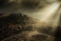 Sfeervol licht op de heuvels van Le Marche in Italië. Een schilderachtige foto met donkere dreigende wolken en licht in een monotone kleur, geïnspireerd door de klassieke landschapsschilders.