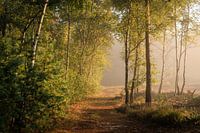 Een ochtend in augustus met een beetje ochtendnevel. Er ontstaat prachtig licht als ik over dit bospad langs een stukje open gebied loop. Doordat dat de zon er van de zijkant inschrijft ontstaat prachtig strijklicht waardoor de berkenstammetjes heerlijk worden verlicht.