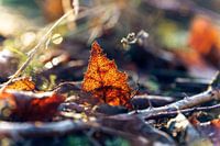 Bruin gekleurde herfstbladeren op de grond tussen takken en grassen. Strijklicht van de ochtendzon schijnt door het blad en toont de nerven, schaduwen en patronen.