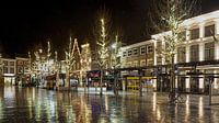 Sfeervol verlicht plein tijdens de nacht in het centrum van Goes, waarbij de natte klinkers mooi reflecteren vanwege een fikse regenbui