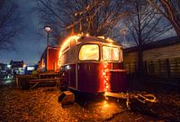 Sfeervol verlichte (aanhang-) camper in de avond. Warmte tijdens een koude winteravond in december