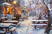 Dit schilderij toont een sfeervolle winterse biergarten, compleet met besneeuwde tafels en warme verlichting die de kou trotseert. Mensen genieten van hun drankjes in een gezellige, winterse ambiance.