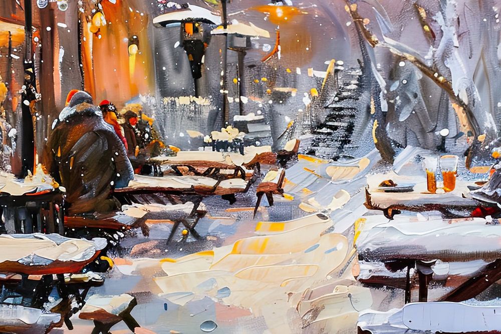 Dit schilderij toont een sfeervolle winterse biergarten, compleet met besneeuwde tafels en warme verlichting die de kou trotseert. Mensen genieten van hun drankjes in een gezellige, winterse ambiance.