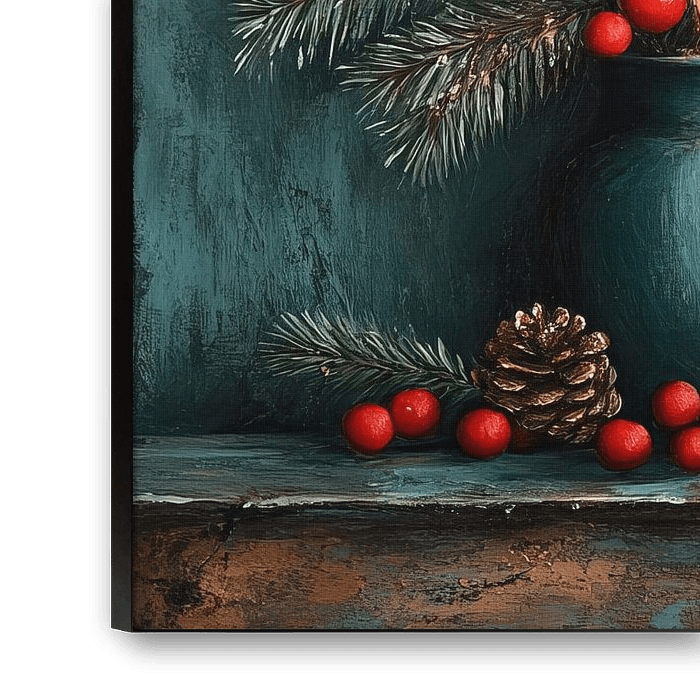 Sfeervolle Kerst Stilleven - Dit Kerst stilleven schilderij toont een sfeervolle compositie met een brandende rode kaars, dennenappels, een tak met rode bessen in een blauwe vaas en suikerstokjes, alle geplaatst op een houten plank tegen een rustige blauwgroene achtergrond.