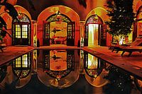 Riads zijn grote particuliere huizen die zijn omgebouwd tot een soort gastenverblijf of hotel voor toeristen in Marrakech, Marokko. Met een centrale binnenplaats met een tuin, fontein en vaak een zwembad zoals hier, veranderen Riads 's nachts in exotische lichtjes, reflecties en ontspanning, waarbij toeristen genieten van de koele bries van de avond na een hete dag sight seeing.