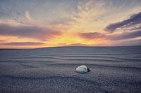 Foto van een schelp op een perfect gevormd strand genomen tijdens de zonsondergang.