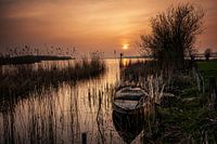 Schilderachtig landschap van een oud Hollandse meester. Natuurlijk haventje in een rietkraag tussen de Nederlandse polder. Verlaten roeiboot aangemeerd langs de waterkant van een groot wateroppervlak met een zonsopkomst of zonsondergang en sfeervol avondrood.