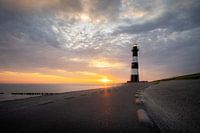 Een fraaie zonsopkomst aan de dijk van Breskens, waar de iconische vuurtoren Nieuwe Sluis zijn licht schijnt.