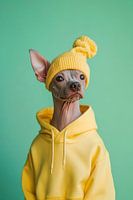 Een heel bijzondere sfinx schittert in een felgele kleur die optimistische levensvreugde uitstraalt. Met zijn nonchalante jas met capuchon en vrolijke pet ziet hij er speels en stijlvol tegelijk uit. Zijn grote, expressieve oren en slanke silhouet geven hem een geheel eigen charme waarmee hij zich onderscheidt van de massa.