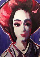 Modern portret van een Japanse vrouw in Kimono, in de stijl van de traditionele Geisha's. Het origineel is gemaakt met ecoline en Oost-Indische inkt waar stukjes bedrukt papier aan zijn toegevoegd.