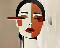 Shades of Silence and Form - Dit portret schilderij toont een vrouwengezicht in een moderne stijl, verdeeld door geometrische vormen in voornamelijk rood en beige tinten.