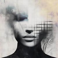 Indringend portret van een vrouwelijk figuur, uitgevoerd in een monochroom kleurenschema dat voornamelijk bestaat uit zwart-wit tinten, wat een dramatische en mysterieuze sfeer creëert. De gelaatstrekken van de figuur zijn gedeeltelijk verhuld door een raster dat een vervreemdend effect geeft en de kijker uitnodigt om dieper na te denken over de identiteit en emoties van het subject. De vage en wazige achtergrond met subtiele natuurlijke elementen, zoals de silhouetten van bomen, voegt een dromerig en soms onheilspellend element toe. Dit kunstwerk speelt met het thema van perceptie en de fragmentatie van het zelf.