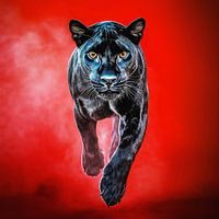 De achtergrond, een vervaagde rode nevel, versterkt de dramatiek van het beeld en geeft de indruk dat deze majestueuze jager uit de duisternis oprijst, klaar om haar volgende stap te zetten. De panter, een symbool van mystiek en kracht, vertegenwoordigt zowel geduld als explosieve actie. Elk detail, van de gespannen spieren tot de reflecties op haar zijdeachtige vacht, getuigt van een hyperrealistische precisie die het werk tot leven brengt.