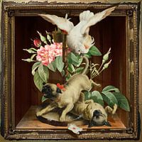 Een collage in een lijst, met 3D-effect, 2 honden, rode bloemen en 1 brutale kaketoe.