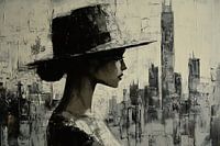 Shadowed Mystique - Dit stadsgezicht schilderij illustreert een elegante vrouw met hoed, in profiel tegen een complexe achtergrond van industriële gebouwen, uitgewerkt in monotone grijsschakeringen en dynamische penseelstreken die een levendige urban texture creëren.