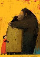Shadows and Friendship - Dit fantasie schilderij toont een jong meisje in een rode jurk die een grote, donkere, harige creatuur omhelst tegen een levendig gele achtergrond.