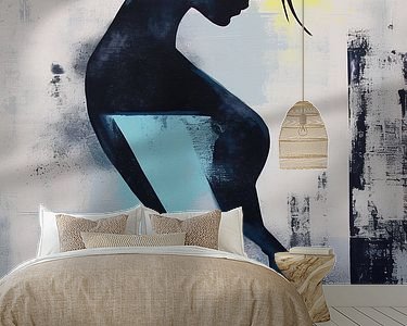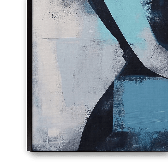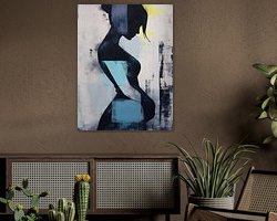 Shadows and Light Dance - Dit vrouwen schilderij toont een gestileerde vrouwelijke figuur in abstracte blauwtinten met een suggestieve houding tegen een multi-textuur achtergrond.