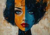 Shadows and Light - Dit vrouwen schilderij toont het gezicht van een vrouw, opgedeeld over een contrastrijke achtergrond die zowel levendige als donkere kleuren bevat. Dit portret maakt diepe indruk door de indringende blik van de vrouw, waarvan de ene helft van het gezicht in warme goudgele en oranje tonen is geschilderd, en de andere helft in koele, donkere blauwe en zwarte tinten. De ogen van de vrouw, diep en helder, kijken direct naar de beschouwer, waarbij het ene oog koel blauw is en het andere een subtiele mix van grijs en blauw. Haar lippen zijn opvallend rood, wat een sterk visueel contrast biedt met zowel de warme als koele kanten van haar gezicht. De schilderstijl kan worden omschreven als een moderne mix van realisme en abstractie, met een ruwe textuur die door de verflagen heen doorschemert.