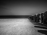 Een golfbreker geeft een herhalende schaduw op strand. De paaltjes van de golfbreker vormen een mooie herhalende lijn richting de zee. De schaduwen herhalen dit spel van lijnen. De foto is gemaakt met alleen infraroodlicht en daarna omgezet naar zwartwit. Deze foto is gemaakt op het strand van Cadzand-Bad. adzand-Bad is een badplaats, in de Nederlandse provincie Zeeland, gelegen aan de kust van Zeeuws-Vlaanderen, in de gemeente Sluis. Cadzand-Bad ligt in het uiterste zuidwesten van Nederland aan de grens met België en is een onderdeel van het naburige Cadzand.Ten westen van Cadzand-Bad bevindt zich, naast het kleine duingebied van de Kievittepolder ook het natuurgebied Het Zwin. Op het strand kan men unieke fossiele schelpen vinden. Vooral de Zwinkokkel komt in grote aantallen voor. Veel zeldzamer zijn de fossiele zwarte haaientanden.