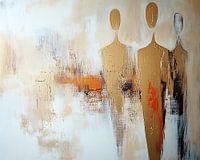 Shadows in the Sunlight - Dit abstracte schilderij toont drie gestileerde menselijke figuren van goud en brons tegen een onscherp achtergrond van aardkleuren met accenten van oranje en wit.