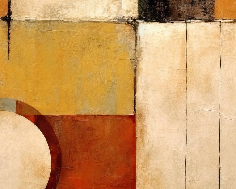 Shadows of Earthy Tones - Dit abstracte schilderij laat een complex van geometrische vormen zien, met een prominente centrale cirkel ingeklemd tussen rechthoekige vlakken in beige, oranje en zwart.
