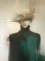 Shadows of Hidden Gaze - Dit moderne portret schilderij toont een intrigerende vrouw gehuld in donkergroen, met een abstracte, textuurrijke hoed die de hele bovenkant van haar hoofd en ogen bedekt, waardoor een gevoel van mysterie en stilistische diepte ontstaat.