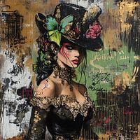 Shadows of Splendor and Script - Dit portret schilderij toont een vrouw met een dramatisch versierde hoed en weelderige gouden sieraden, tegen een abstracte achtergrond met grafische elementen.