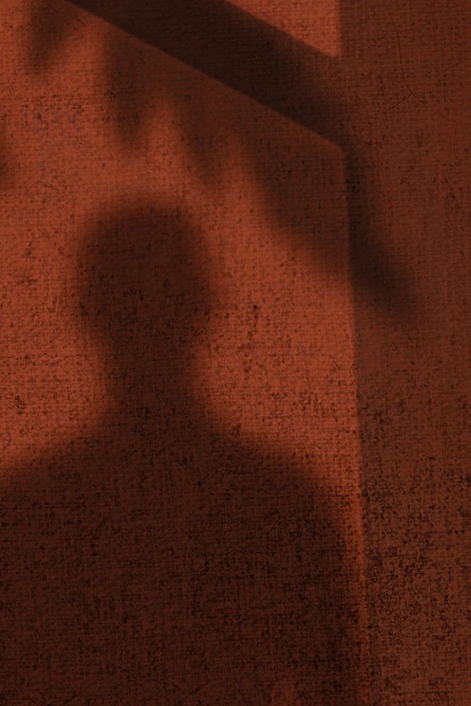 Modern, bijna surrealistisch werk. Schaduwen op een bruine muur. Sfeervol in al zijn eenvoud.