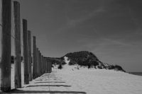 Houten palen die een afzetting vormen bij het Kattegat, werpen fraaie schaduwen op het duinzand van de Noord-Hollandse duinen bij Bloemendaal aan zee.