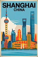 Een levendig stadslandschap schittert in felle kleuren, waar futuristische wolkenkrabbers de hemel in zweven. De iconische Oriental Pearl Tower en de gebogen vorm van de Shanghai Tower geven de skyline een unieke flair. Zachte wolken spelen rond de architectonische meesterwerken, terwijl het water van de haven een glinsterende weerspiegeling biedt van de moderne metropool.