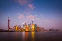 De beroemde skyline van het district Pudong in de Chinese wereldstad Shanghai. De zon gaat onder waardoor de lucht een roze kleur heeft, terwijl de wolkenkrabbers al verlicht zijn.