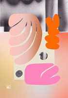 'Shape Garden' is een speels werk geïnspireerd door Matisse, met een moderne twist. Warme roze en oranje tinten vloeien door abstracte bloemvormen, afgewerkt met spraypaintdetails die zorgen voor een urban edge.
