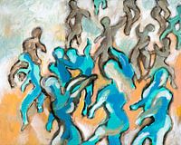 Mensen: bewegend, zwervend, dansend... geïnspireerd door de vormen van mensen, spelend met schaduw, licht en compositie. Een spontaan, open schilderij