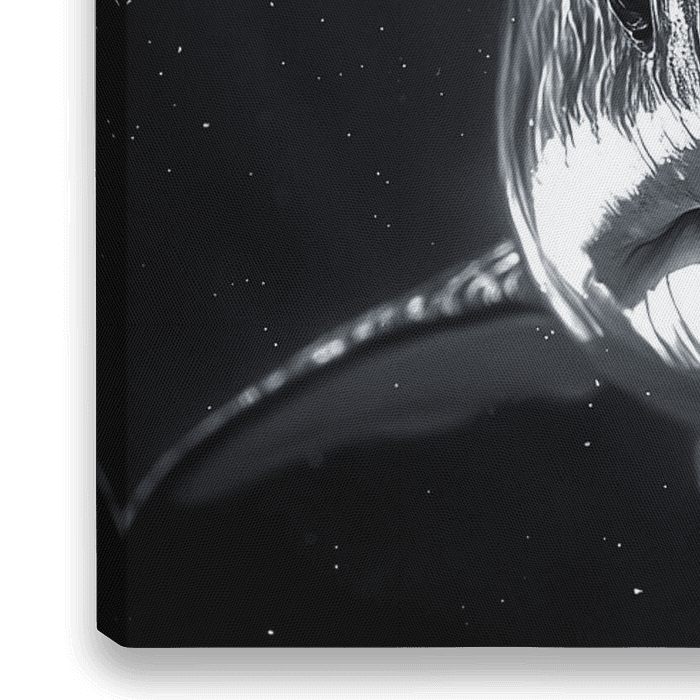 In een zwart-wit opname verschijnt een haai frontaal, zijn gestroomlijnde kop dominant in beeld. Achter hem breekt subtiel licht door de donkere oceaan, gevangen in zwevende zuurstofbellen. De achtergrond blijft mysterieus en diep, terwijl het licht zijn huid accentueert. Een krachtig, tijdloos beeld van leven onder druk en diepte.