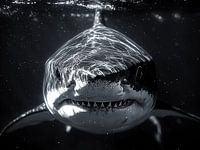 In een zwart-wit opname verschijnt een haai frontaal, zijn gestroomlijnde kop dominant in beeld. Achter hem breekt subtiel licht door de donkere oceaan, gevangen in zwevende zuurstofbellen. De achtergrond blijft mysterieus en diep, terwijl het licht zijn huid accentueert. Een krachtig, tijdloos beeld van leven onder druk en diepte.