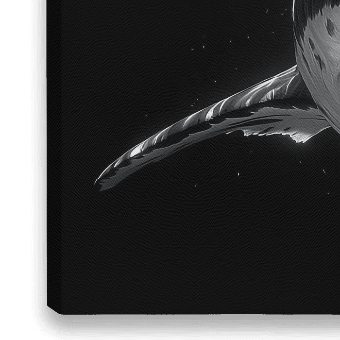 In een intens zwart-wit beeld vult de haai het frame, frontaal en krachtig. Zijn kaken licht geopend, ogen scherp en glanzend, straalt hij dreiging en majesteit uit. De diepzwarte achtergrond elimineert afleiding, waardoor de textuur van huid en tanden rauw en puur naar voren komt — een portret van oerkracht.