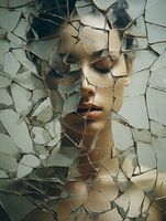 De gebroken spiegel, symbool van zowel fysieke als emotionele breuken, kwetsbaarheid en verstoring. Een krachtig beeld van een vrouwelijk gezicht in een complex mozaïek van reflecties: integer, intrigerend, introspectie, chaos en rust.
