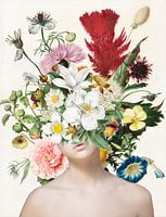 Collage van diverse afbeeldingen, waaronder 2 vintage botanische prenten. Een surrealistisch en romantisch tafereel.