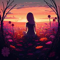 Een meisje zit vredig tussen de wildbloemen te genieten van de zonsondergang. Ze zit volledig in haar eigen wereldje weg te dromen. Het schilderij doet denken aan de lange, warme en gezellige zomeravonden.