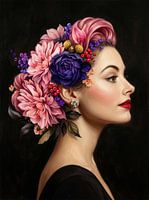 Een klassiek portret van een klassieke, wat rijpere en prachtige vrouw met een kapsel van bloemen.