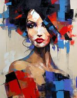 Expressief portret van een mooie vrouw in voornamelijk rood,blauw,beige en zwart tinten.