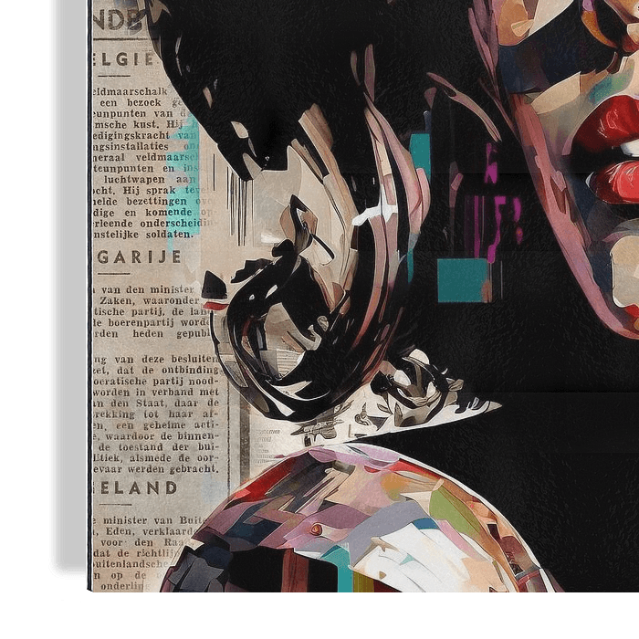 Collage met het kleurrijke portret van een vrouw.