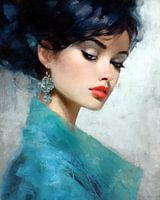Impressionistisch portret van een vrouw in voornamelijk turquoise en grijs tinten.