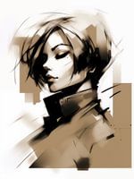 Portret van een vrouw in voornamelijk zwart,taupe en beige tinten.