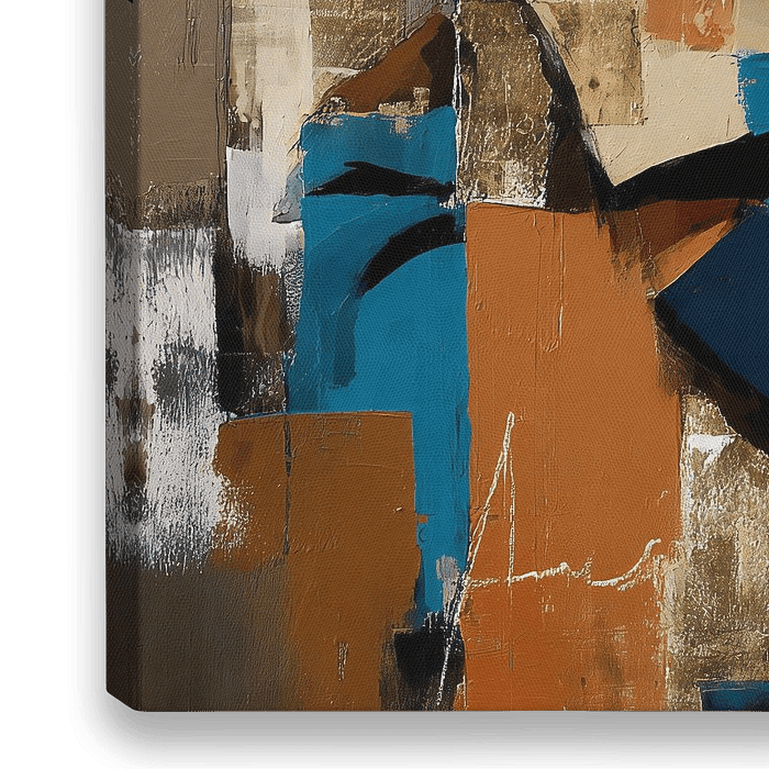 Mixed media schilderij in aardetinten met goud accenten in een retro stijl.