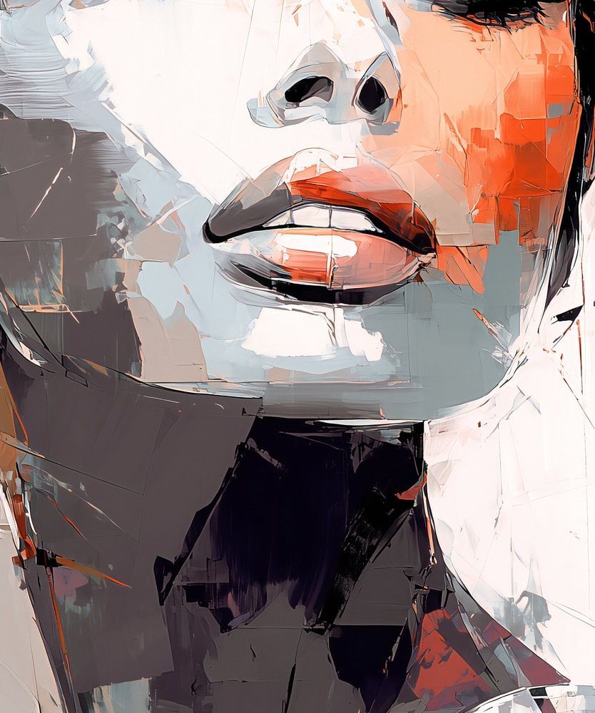 Abstract gefragmenteerd portret van een vrouw in voornamelijk grijs,taupe en oranje tinten.