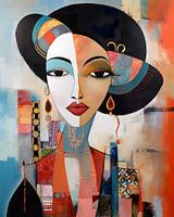 Kleurrijk abstract portret van een vrouw in collage stijl.