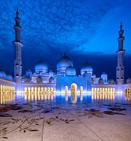 Na zonsondergang in korte tijd werd de lucht achter de Sheikh Zayed-moskee blauw. Met de blauwe verlichting van de moskee zelf geeft het een mooie oosterse tint aan het tafereel, waardoor de bloemen in het marmer op de vloer nog meer benadrukt worden.