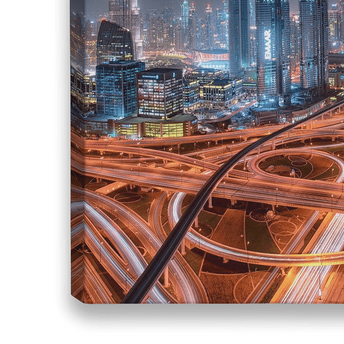 Laat in de avond is Sheikh Zayed Road vol met mensen die naar huis terugkeren. Aan de linkerkant verlicht Burj Khalifa de lucht en steekt hoog uit boven alle andere gebouwen in Dubai.