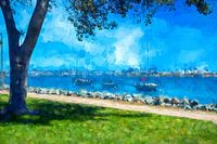 Een schilderachtige waterkant is afgebeeld met boten die rustig op het water dobberen en een skyline van de stad in de verte. Een grote boom met weelderig gebladerte staat prominent op de voorgrond en werpt een schaduw over het grasveld.